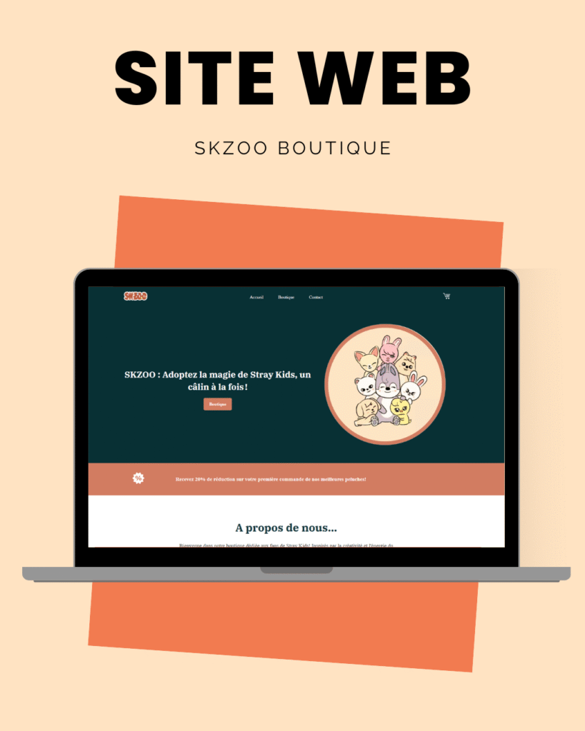 J’ai choisi de créer un site autour de SKZOO, les peluches représentant les membres du groupe K-pop Stray Kids. Étant fan du groupe, c’était l’occasion parfaite de mêler passion et apprentissage. Je me suis inspirée de l’univers graphique de Stray Kids ainsi que de l’esthétique kawaii des produits dérivés pour construire une identité visuelle cohérente et engageante.